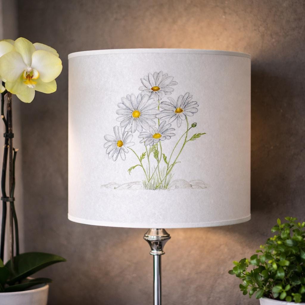 Cylindrical lampshade decorated with a hand-painted watercolor daisy motif, bringing a fresh and delicate floral touch to a contemporary interior. Made from lampshade-grade polyphane, it softly diffuses the light for a warm and harmonious ambiance.